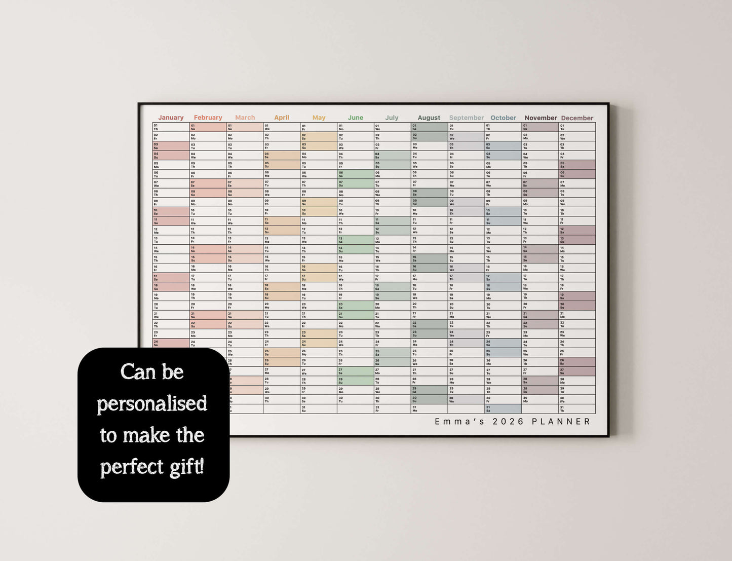 Stay organised all year with our beautifully designed Personalised 2026 Wall Planner in landscape. Perfect for families or students to plan their year ahead, or home offices, studios, and shared workspaces, this planner helps you see the year at a glance without overwhelming your space.